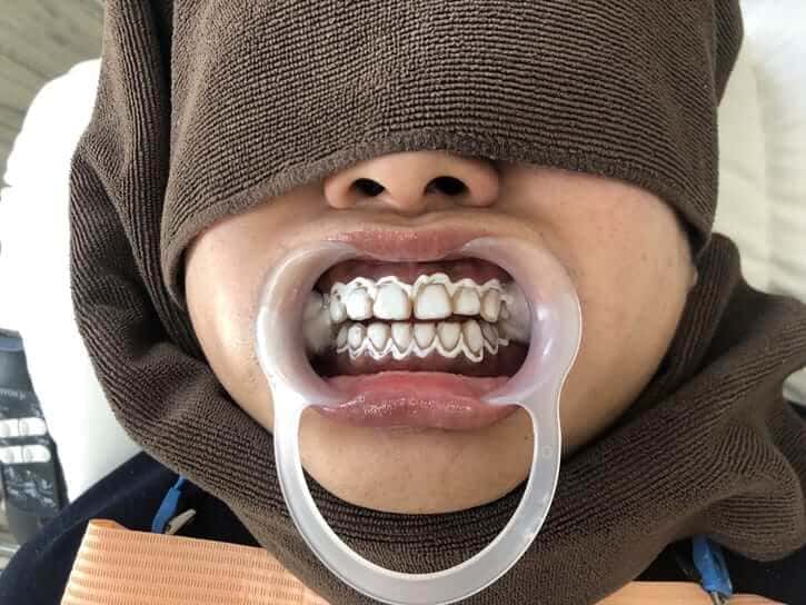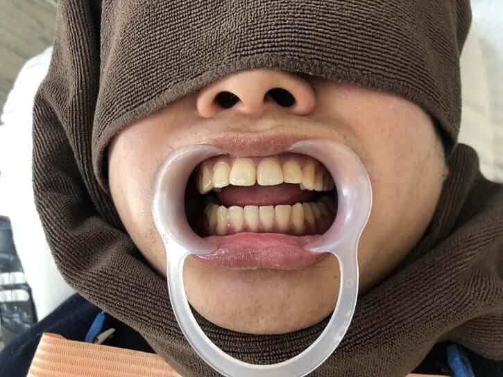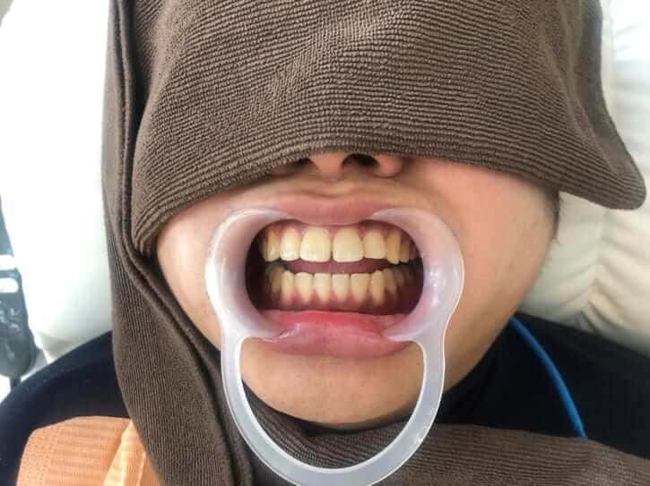 上下の前歯2本は白さを取り戻しつつあるように見えますが、サイドに生える犬歯はまだ黄ばみが残っている状態です。