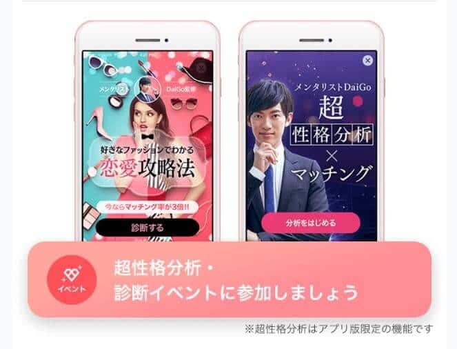 DAIGOがプロデュースした心理テストや性格分析テストなどのコンテンツを利用することで、自分と似た価値観を持つ女性うや自分と相性の良い女性をアプリが導き出してくれるのです。