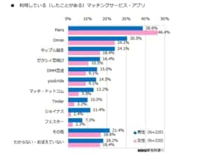 MMD研究所調べでは、スマートフォンを所有する20~30代独身男女のマッチングアプリアプリの認知度38.2%(女性25.2%)、うち男性の10.6%、女性の8.1%が「現在利用している」と回答、男性の12.4%、女性の14.6%が「過去に利用していた」と回答。